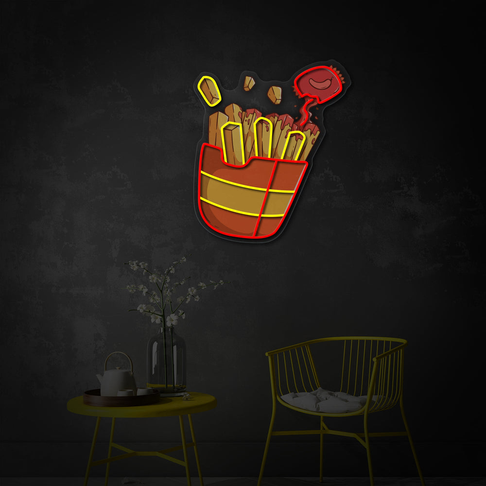 "Papas fritas con salsa de chile, comida rápida" Letrero de neón LED impreso con UV
