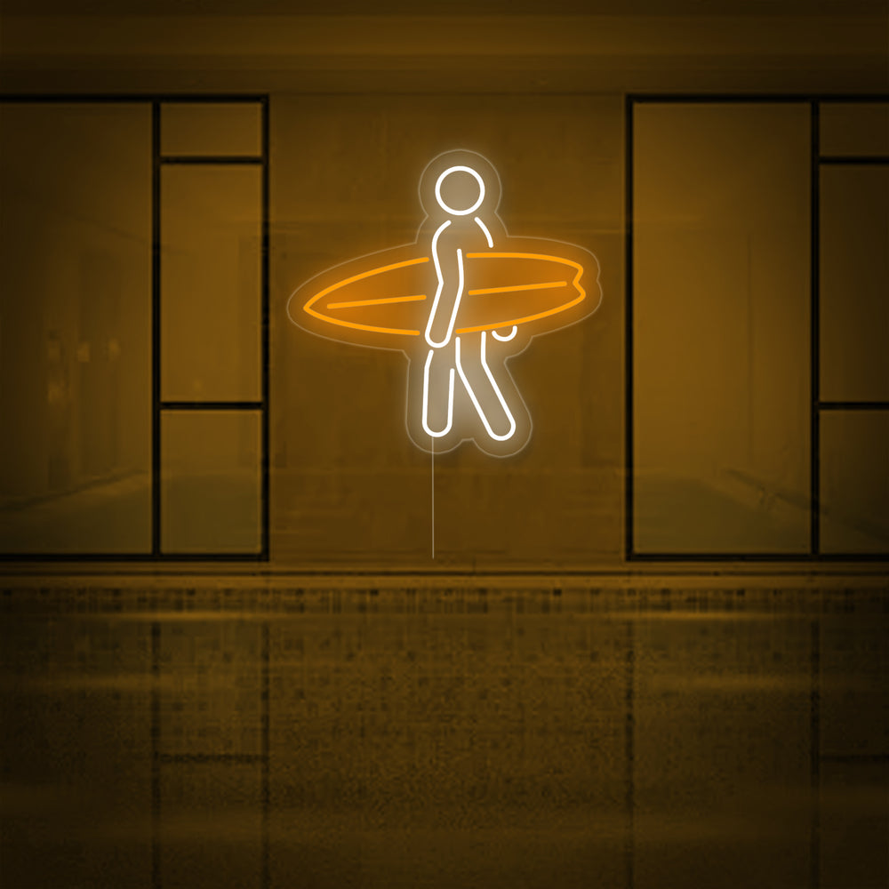 "Hombre Llevando Una Tabla De Surf En El Deporte De Surf" Letreros Neon